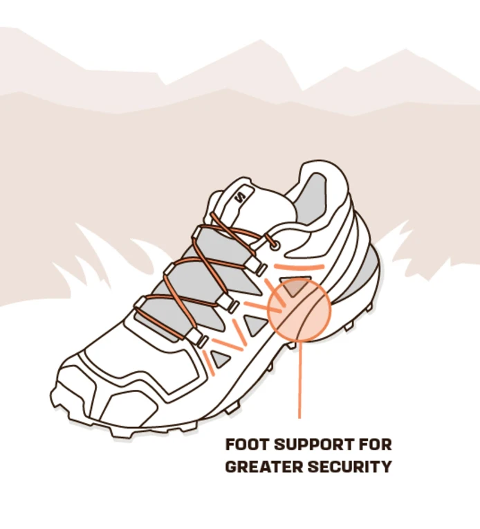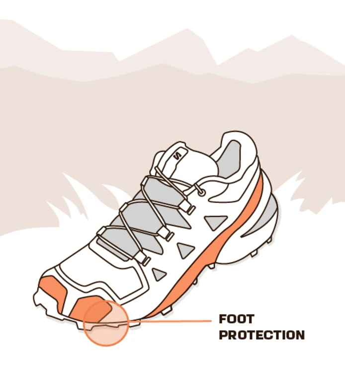 Pantofii de alergare montană au în general protecție încorporată. Plăcile incorporate îți protejează antepiciorul de traseele stâncoase, iar dispozitivele de protecție pentru degete și fețe adaugă protecție suplimentară împotriva pietrelor și a vegetației ascuțite.